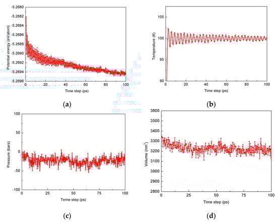 The configuration of the system was firstly established; it was then relaxed by energy minimization to ensure no existence of steric clashes or inappropriate geometries. The convergence of the pressure, temperature, potential energy, and volume as a function of different times was conducted to ensure that the system reached a proper equilibrium, as shown in Figure 5. In these figures, the pressure and density have no significant change with time, and the energy potential and temperature gradually tend to stabilize when the time is greater than 100 ps. In other words, the simulation model can be presumed to be convergent, and it reaches a steady state. To verify the correctness of the intermolecular potential functions, Table 1 shows the elastic constants of calculated data by LAMMPS and experimental data [25,29,30,31,32,33,34]. It can be seen that, except for the elastic modulus C44 of the Zr atom, the errors of other elements were within 5% between calculated data and experimental data. The error in C44 might be attributed to the improper shearing model to predict C44 or the incorrect parameterization for the hexagonal close packed (HCP) structure of the Zr atom. However, as shown in the literature [35,36], it should be emphasized that classical models are not always reliable and should be subjected to careful fitting to first-principle data. Furthermore, other more detailed verifications, such as atomic equilibrium distance, coefficient of thermal expansion, Tg and Tm, and so on were individually performed and discussed.