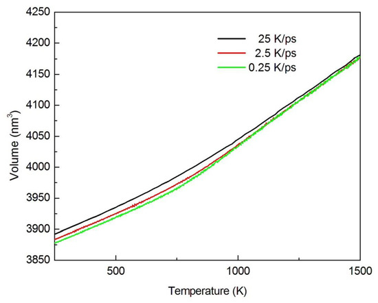 Volume variations of 185,000 atoms as a function of temperature under different quenching rates of Zr53Cu30Ni9Al8 alloy.