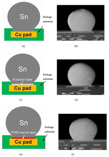 Schematic diagram and SEM image of full solder ball without a barrier layer (a,b), with an Ni barrier layer (2.5 µm thick) (c,d), and with a Zr53Cu30Ni9Al8 thin film metallic glass (TFMG) barrier layer (100 nm thick) (e, f).