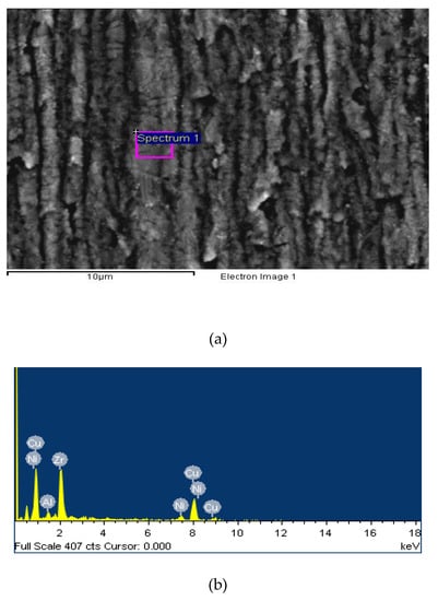 In order to confirm the structure of the Zr53Cu30Ni9Al8 TFMG deposited by sputtering, this TFMG was investigated by scanning electron microscopy (SEM) (JEOL JSM-7000F) and energy-dispersive X-ray spectroscopy (EDS). The accelerating voltage for SEM/EDS was set to 5 kV, with a 30-s lifetime. The results of X-ray diffraction revealed that the Zr53Cu30Ni9Al8 alloy film exhibits a typical amorphous diffraction pattern. The ratio between Zr, Cu, Ni, and Al as an atomic percentage in the amorphous thin film was identified by SEM/EDS. The elemental composition data on the amorphous thin film are shown in Figure 8 and Table 2. The ratio between Zr, Cu, Ni, and Al as an atomic percentage in the amorphous thin film identified by SEM/EDS for Zr51Cu32Ni10Al7 was very close to the designed Zr53Cu30Ni9Al8 goal. When the barrier layers were deposited, the SAC305 solder balls of 300 μm diameter could be placed manually on the Cu pad and were held in place with a flux. Immediately, Cu pads of the substrate and the solder ball were joined together in an oven at 260 °C for 30 min.