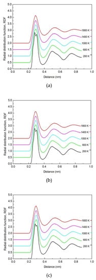 To analyze the structural differences for different compositions and quenching rates, the RDF curves for all configurations were compared. The results indicated that changes in quenching rates have only slight effects on the structure rearrangement when Zr53Cu30Ni9Al8 alloy is quenched from 2000 K down to 200 K. This is due to the Zr53Cu30Ni9Al8 alloy containing four elements, with differences in the atomic radii, which satisfies the Inoue group argument [42]. In addition, it can be seen from Figure 9 that, as the quenching rate went from 0.25 to 25 K/ps, the amorphous ratio of the samples was high. In other words, the Zr53Cu30Ni9Al8 alloy has a high probability of forming as an amorphous state in this quenching rate interval. Figure 10 shows that, as the temperature was decreased from 1800 K to 200 K, the first peak of the RDF curve increased while the full width at half maximum (FWHM) decreased gradually. For instance, as shown in Figure 10a, the height of the first peak under a quenching rate of 0.25 K/ps increased from 2.2 to 2.8, while the FWHM decreased from 1.9 nm to 1.4 nm as the temperature decreased from 1800 K to 200 K. Same situations can be found for the quenching rates of 2.5 K/ps and 25 K/ps, as shown in Figure 10b,c, respectively. This indicates that the density of atoms was distributed at higher concentration as a function of distance from a reference particle at lower temperatures, exhibiting a more crystalline state, especially when comparing the glassy and the liquid state. In addition, the second peaks of RDF curves became more explicit, splitting as the temperature decreased, which is a common feature of amorphous metal. Therefore, the results confirmed the structural change of microstructures as being in short-range order under the fast quenching rates. For the total pair, the first splitting occurred at about 500 K with a higher quenching rate, but the first splitting occurred at about 300 K with a lower quenching rate, below the temperature of Tg. Tsplit is determined by visual inspection of the RDF curve at different temperatures. The results revealed that some substructures formed in like atom pairs before reaching the final glassy state.