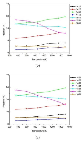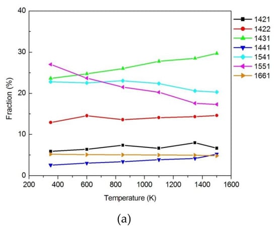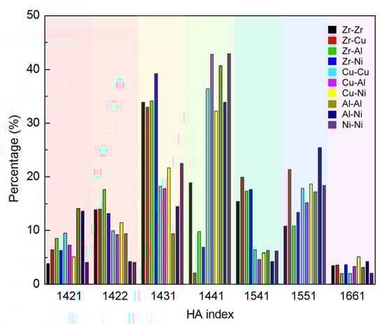 The atomic radii of Zr, Cu, Ni, and Al are 1.55, 1.35, 1.35, and 1.25 Å, respectively, with the atomic size of Al smaller than that of Zr by about 20%, while the HA fraction distributions for different atom type pairs maybe different. For this reason, it is necessary to further explore the relationship between different atom pairs and the HA index distribution. Therefore, a more detailed analysis of the HA indexes of different atomic pairs in Zr53Cu30Ni9Al8 after quenching of 25 K/ps at 100 K is shown in Figure 12. The Zr-related HA indexes (Zr–Zr, Zr–Cu, Zr–Ni, and Zr–Al) form the highest fractions of 1541 and 1431 among all pair types, where 1541 and 1431 are indexes for the defect icosahedra and FCC defect local (or distorted icosahedra) structures, respectively. The Cu, Ni, and Al-related HA indexes (Cu–Cu, Cu–Ni, Cu–Al, Ni–Al, Ni–Ni, and Al–Al) form the highest fractions of 1441 among all pair types, which are employed to identify the local BCC structure. This indicates that the zirconium atoms more easily produce an amorphous state with other atoms due to a larger difference in atomic radius.
