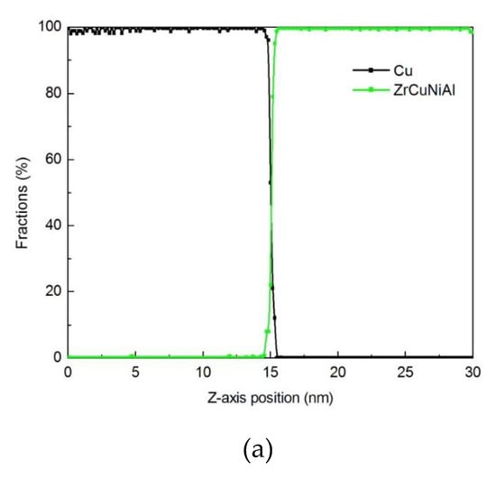 To obtain the Cu (polycrystalline)/Zr–Cu–Ni–Al (after quenching) interface model of size 30 nm width (x-axis) × 30 nm height (z-axis) × 5 nm thickness (y-axis), we started by constructing a Cu/Zr–Cu–Ni–Al crystalline model. The bottom layer was filled with Cu atoms (15 nm height) and the simulation box above it was filled with Zr–Cu–Ni–Al atoms. Initially, both Cu and Zr–Cu–Ni–Al layers were kept in contact along the interface in the x–y plane with a separation distance of 3.5 Å. The interface separation distance was chosen based on the equilibrium bond lengths. It was previously shown that, as long as the interface separation distance is not too small or not too large, it does not affect the results [27].