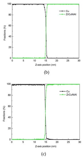 Concentration distributions of Zr53Cu30Ni9Al8/Cu quenched at (a) 25 K/ps, (b) 2.5 K/ps, and (c) 0.25 K/ps along the diffusion couple (Z-axis) direction (at 600 K after a 2000-ps equilibration process).