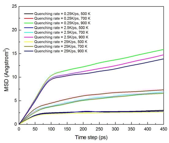 To analyze the thermodynamic properties of the Zr–Cu–Ni–Al alloy for different compositions and quenching rates, the relationship between volume and temperature was compared. Figure 6 shows the volume of 185,000 atoms versus temperature curves at different quenching rates of 0.25, 2.5, and 25 K/ps, which reveals the quenching rate dependence of glass transition temperature. In order to acquire a more refined estimate of glass transition temperature, the data were captured with smaller increments in temperature, i.e., 1 K, from 200 to 2000 K. During the quenching process, the volume vs. temperature curve with a quenching rate of 25 K/ps showed a slope change at about 725 ± 30 K, which indicates that glass transition occurs at this temperature. Similar results were obtained in the experiments by Chang et al. [37] and Jang et al. [38]. As the quenching rate is within the range from 2.5 K/ps to 25 K/ps, there exists no significant difference in turning points due to no obvious crystalline structure at these quenching rates. The glass transition temperature of Tg slightly decreases with the decrease in quenching rate. The result shows that a decrease in quenching rate causes an essential decrease in the volume at T < Tg, and the system is better equilibrated at a lower quenching rate. Figure 6 also shows that a higher quenching rate leads to a larger free volume in the final glassy state. When the quenching rate increased 10-fold from 0.25 to 2.5 K/ps, the volume of Zr–Cu–Ni–Al after quenching increased by approximately 1%. The predicted melting temperature of 1170 ± 30 K by MD calculations is in reasonable agreement with the experimental melting temperature of 1135 K [38]. In addition, the coefficient of thermal expansion (CTE) can be calculated through a volume–temperature diagram. The CTE of Zr53Cu30Ni9Al8 amorphous alloy in this work was about (12 ± 2) ×10−6/ K, similar to the experimental data reported in the literature [39,40]. In order to further understand the microstructures in amorphous structures, pair analysis techniques, especially the bond-type index method of Honeycutt–Anderson (HA) [41], were applied. The mean square displacement (MSD) profiles at temperatures ranging from 300 to 900 K for Cu–Ag and Zr–Cu–Ni–Al amorphous metal were used to investigate their dynamical properties.