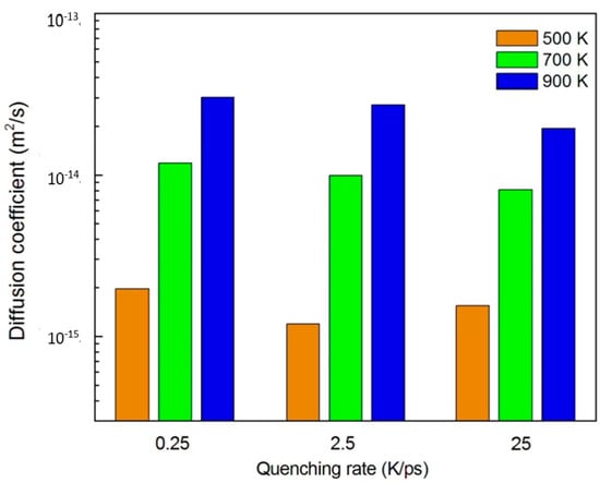 In order to understand the diffusion behavior between copper and various structures of Zr–Cu–Ni–Al alloys, the interface between Cu and Zr–Cu–Ni–Al alloy layers was investigated at various time steps. Figure 13 shows the cross-section snapshots of the Cu/Zr–Cu–Ni–Al interface under quenching rates of 0.25, 2.5, and 25 K/ps at 600 K after a 2000-ps equilibration process. As demonstrated in this figure, no obvious proliferation was found of Zr–Cu–Ni–Al with quenching rates between 0.25 K/ps and 25 K/ps, while only some of the Cu atoms deviated from their original lattice positions. However, as the time increased, the thickness of the inter-diffusion layer (also called the interfacial region), where the individual concentrations of Cu and Zr–Cu–Ni–Al were both over 5 at%, became thicker. To further quantitatively characterize the diffusion process, the concentration profile was acquired. Figure 14 shows the concentration distributions of Cu and Zr–Cu–Ni–Al along the diffusion couple (Z-axis) direction obtained at 600 K after 2000 ps with different quenching rates. The thickness of the interfacial region was only approximately 1 nm when the quenching rate ranged between 0.25 K/ps and 25 K/ps. This indicates that the effects of the three different quenching rates on the diffusion are very small since the microstructure became highly amorphous (>98%) at these quenching rates. The mean square displacement (MSD) of atoms in the interfacial region was used to investigate their dynamical properties. Figure 15 shows the MSD of Cu and Zr–Cu–Ni–Al as a function of time within the temperature range from 500 K to 900 K obtained in the present work. It is clear that the slopes of the MSD profile are generally larger at a higher temperature. However, the effects of the three different quenching rates on the diffusion are also very small. According to the different temperatures and the MSD curves of the Einstein equation, the total diffusion coefficient near the Cu/Zr–Cu–Ni–Al interface at different temperatures could be obtained as shown in Figure 16. It can be inferred that the diffusion coefficients between Cu and Zr–Cu–Ni–Al significantly increased with the increase in temperature when the system temperature exceeded the glass transition temperature. The values of these diffusion coefficients had no significant difference at different quenching rates, indicating that there was no significant difference in structure at these quenching rates.