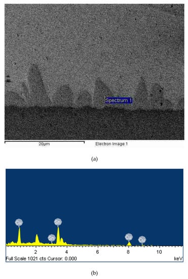- Mookam, N.; Tunthawiroon, P.; Kanlayasiri, K. Effects of copper content in Sn-based solder on the intermetallic phase formation and growth during soldering. IOP Conf. Ser. Mater. Sci. Eng. 2018, 361, 012008. [Google Scholar] [CrossRef]