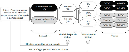 Figure 1 illustrates the detailed experimental series for clarifying the effects of aggregate surface conditions on IFT and then on the compressive strength of QTC. As shown in the figure, the first terms, “C” and “F,” indicate the compressive and IFT tests, respectively. The second terms (“00” and “15”) designate the content (0.00 and 0.15 wt%) of FADPs adhered to the surface of the aggregate with the weight ratio. Furthermore, the last term represents the aggregate water saturation content: “50” indicates a 50% aggregate water saturation content. For example, C-15-100 refers to the compressive test on the specimen using aggregates with 0.15 wt% of the FADP amount and a 100% aggregate water saturation content.