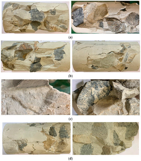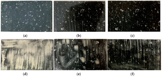 Figure 2 illustrates the geometry of the IFT samples, and Figure 3 provides photos that show the surface condition of aggregates that correspond to different amounts of FADPs and different aggregate water saturations. The granite aggregate was collected from railway ballast. It can be seen that there is about half of the moisture remaining in the aggregate without FADPs and 50% water saturation of the aggregate surface (Figure 3b). In addition, for the aggregate with 100% water saturation, the entire surface is wet. As the content of aggregate water saturation increases, it can be seen that FADPs are mixed with water on the aggregate surface (Figure 3d–f). All the sliced aggregates were assumed to have identical roughness based on the use of the same cutting method. All specimens were cured at room temperature to create the same environment as the actual track system.