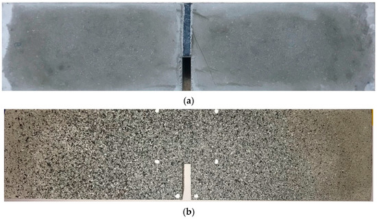 Specimen preparation for the digital image correlation (DIC) analysis [4]. (a) Surface of the fracture toughness test specimen; (b) surface of the fracture toughness test specimen with the applied stone spray.