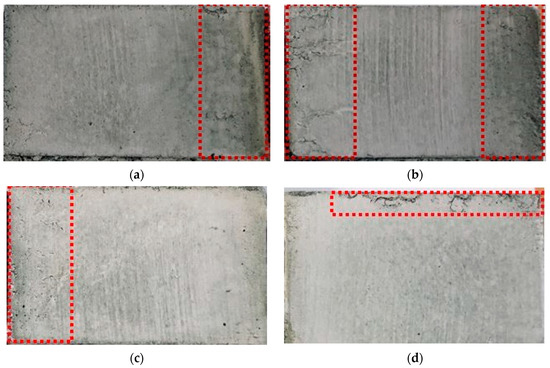 Figure 8 shows the fractured interface, after IFT tests, between the aggregate and QM, which corresponds to different water saturations of the aggregate. In the figure, the red boxes indicate the area where pores occurred at the interface. For the specimens without any FADPs on the aggregate surfaces, aggregate water saturation caused an increment of the water/cement ratio of the concrete [5], and consequently, the porosity in the concrete increased [24]. However, for the specimens using the aggregate with 0.15 wt% FADPs, the water/cement ratio at the interface was reduced because of the water absorption by the FADPs on the surface of the aggregates and the cleaning effects of the aggregate surface.