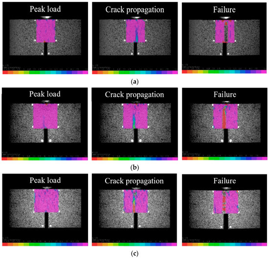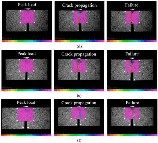 Figure 11 shows the transverse strain contour during IFT tests. The first set of images shows the state of the specimen under the peak load and the second set of images shows the interfacial crack propagation, taking 0.3 s after peak loads. The last set of images shows the state of the fracture. In the first set of images (peak load), all specimens were unchanged in transverse strain contour. As shown in the second set of images, DIC analysis indicates that the initial crack quickly propagates with decreasing IFT. For the specimens without any FADPs, the crack propagated faster as the contents of aggregate water saturation increased from 0 to 100% (Figure 11a–c). This phenomenon can be explained by the reduced interfacial adhesion due to the increased W/C ratio in ITZ as the aggregate water saturation increased. However, the crack propagation (using the sliced aggregate with 0.15 wt% FADPs) decreased as the content of aggregate water saturation was increased from 0 to 100% (Figure 11d–f). The reduction in the W/C ratio at the interface resulted from the absorption of water by the FADPs on the surface of the aggregate and the cleaning effects of the aggregate surface. It should be noted that crack propagation of the whole series occurred exactly at the interface between the aggregate and QM because the IFT value is significantly low. If it had a high IFT, the adhesion between the aggregate and mortar would have been strengthened, and the crack would have propagated into the mortar. Lee et al. [4] also reported that the higher IFT specimens show that the cracks propagate through the QM.