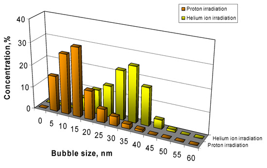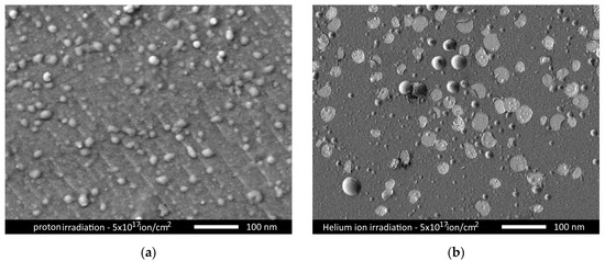 As can be seen from the data presented, in the case of proton irradiation on the surface of ceramics, the formation of spherical inclusions is observed, the average size of which does not exceed 10−15 nm (see Figure 3). These inclusions are gas-filled bubbles resulting from implantation and subsequent agglomeration of hydrogen or helium in the structure of the surface layer. The mechanism of bubble formation is as follows. When irradiated with low-energy particles, the path length of which ranges from 300 nm to 3–5 μm, the main energy losses causing drag are inelastic collisions with nuclei, which lead to distortions and deformations of the crystal lattice, most of which annihilate in a short period of time. In this case, the remaining part of the formed defects is able to begin to migrate along the structure, thereby introducing additional deformation effects as a result of cascading collisions. In the case of large radiation doses of 1 × 1017–5 × 1017 ion/cm2, a large number of overlapping cascade defects are observed during the interaction of ions with the crystal structure of the irradiated target, which can be from 1000 to 100,000 overlaps [30]. It is also worth noting that, in the case of protons and helium ions, in view of their weak solubility and great ability to implant, and subsequent agglomeration near grain boundaries, at high radiation doses voids filled with gas can form in the structure, as well as strongly deformed regions. Due to their nature, these can be squeezed to the surface as a result of overstresses and deformations of the crystal structure. Moreover, in the case of irradiation with helium ions, not only does the size of the bubbles increase, but most are destroyed, which indicates a partial degradation of the surface layer. The presence of craters from exploding bubbles, as well as smaller bubbles, indicates swelling and embrittlement of the surface layer as a result of the accumulation of implanted helium at high radiation doses, which amounted to 3.7% for the maximum radiation dose.
