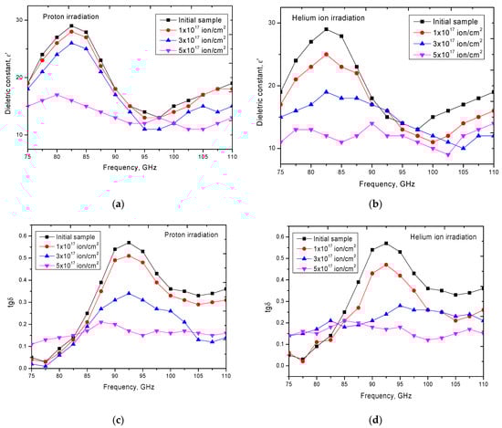 Graphs of the dependence of the dielectric constant on the type of exposure: (a) proton irradiation; (b) helium ion irradiation; and dielectric loss (tgδ): (c) proton irradiation (d) helium ion irradiation.