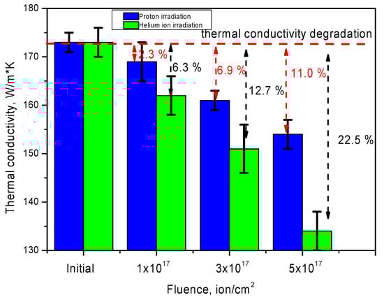 As can be seen from the data presented, in the case of proton irradiation and the accumulation of defects in the structure of ceramics as a result of hydrogenation, the maximum thermal conductivity is reduced at a dose of 5 × 1017 ion/cm2 by no more than 11% of the initial value. However, the occurrence of helium inclusions in the structure and a high concentration of defects lead to a sharp deterioration in heat dissipation and a decrease in the thermal conductivity by an amount exceeding 20% at the maximum radiation dose.