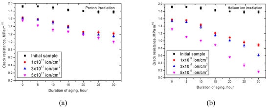 Graphs of the dependence of the crack resistance on the aging time of the samples: (a) proton irradiation; (b) helium ion irradiation.
