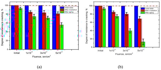 Diagram of the dependence of changes in the degree of resistance to cracking: (a) proton irradiation; (b) helium ion irradiation.