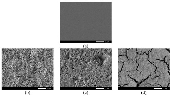 SEM images of ceramic: (a) initial sample; (b) initial sample after aging; (c) proton irradiation after aging; (d) helium ion irradiation after aging.
