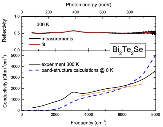 Top panel: [001]-plane reflectivity of Bi2Te2Se at 300 K: measurements (black line) and fit (red line). Bottom panel: bulk optical conductivity (real part) of Bi2Te2Se, as obtained from the reflectivity fit (black straight line) and the inter-band portion of optical conductivity, computed from the band structure of Figure 3 at 0 K (dashed line), as detailed in the text. The thin orange line is to mimic a linear increase in frequency.