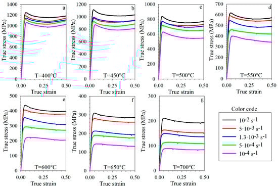 After reaching the peak stress, a work-softening stage was observed (Figure 1a–e). The work-softening became less pronounced with an increase in temperature or with a decrease in strain rate. At 500 °C and low strain rates (10−4–5·10−3 s−1), or at higher temperatures of 550–700 °C and any examined strain rates, a steady-stage flow stage was observed after softening. Some increase in flow stress at ε~0.35 at relatively low temperatures (400–500 °C) can be associated with friction between the die and the specimen surfaces (Figure 1a,b).