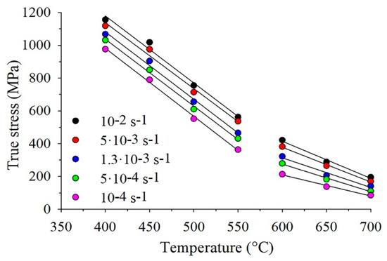 Since the steady-stage flow stage cannot be recognized at some compression curves, the value of stress corresponding to ε = 0.25 was used for activation energy analysis (Figure 1). Dependences of flow stress on deformation temperature for different strain rates revealed an inflection point at 550–600 °C (Figure 2) that may suggest different controlling mechanisms of deformation in two temperature intervals: 400–550 °C and 600–700 °C.
