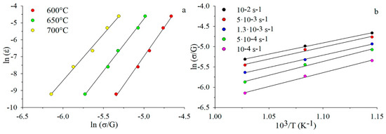 The values of n and Q can be found as the slope of the ln() – ln(σ/G) and ln(σ/G) – 103/T plots (Figure 3), respectively. The value of n changed from 6.8 to 5.5 for 600 and 700 °C, respectively. The activation energy was found to be 316 ± 35 kJ/mol using the mean value of n = 6.2 and by averaging different values of Q at five strain rates.