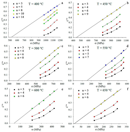 In the lower temperature interval (400–550 °C), the n values were unusually high: 27 at 400 °C and 10 at 550 °C. The activation energy Q = 470 kJ/mol was much higher than that for the interval 600–700 °C; generally, very high values of n and Q are associated with the presence of the threshold stresses σth. The values of σth were determined as the stress level below which no strain rate can be detected [28]. When the stress level exceeds σth, the strain rate is greater than zero. Therefore, the values of σth can be estimated by extrapolating the 1/n – σ linear relations (plotting for different n) to the zero strain rate [28,29] (Figure 4).
