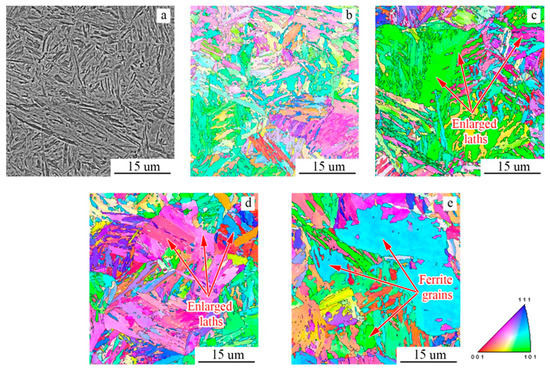 Microstructure of the as-quenched Fe-0.36wt.%C-1wt.%Cr steel (Figure 5a) consisted of initial austenitic grains divided by martensite packets, blocks or laths [31]. Subsequent soaking of the as-quenched steel at 400, 500, 600 or 700 °C for 10 min resulted both in the martensite decomposition and in the onset of recovery and recrystallization development [32,33] (Figure 5b–e). Inverse pole figures (IPF) maps show that the finest structure formed at 400 °C (Figure 5b). With an increase in the temperature to 500 or 600 °C (Figure 5c,d), martensite laths gradually transform into relatively large areas of tempered martensite (the microstructure is still martensite; however, the concentration of carbon is already close to that in ferrite [32]). Heating to 700 °C promoted the formation of large ferrite grains with irregular shape primarily surrounded by martensitic packets (Figure 5e). The incomplete martensite decomposition caused by the short exposure at the elevated temperatures can be terminated during further warm deformation [11].