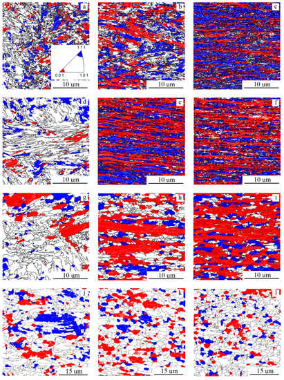 Texture component maps after deformation with a strain rate of 1.3·10−3 s−1 at 400 (a–c), 500 (d–f), 600 (g–i) or 700 °C (j–l) to ε = 0.3, 0.77 or 1.15. Notation: high-angle boundaries (with misorientations ≥ 15°) are black, low-angle boundaries (with misorientations 2–15°) are white. Color code is shown in Figure 6a. The compression axis is vertical in all cases.