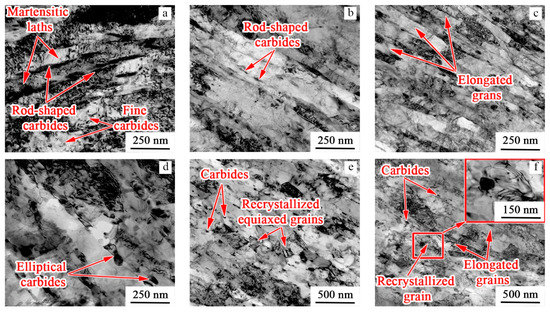 After heating to 500 °C (Figure 7d), the microstructure became somewhat coarser in comparison with that at 400 °C. Some of the laths were almost free of dislocations while some of them contained dislocation arrays and pile-ups. Carbide particles (length 50 nm and thickness 20 nm) of elliptical shape were mainly located at lath boundaries. After deformation, fine elongated grains were observed (Figure 7e,f). Inside the grains, dislocation pile-ups and transversal sub-boundaries formed. In addition, some very fine equiaxed grains (diameter 200 nm) were observed—an example is shown in the insert in Figure 7f at a higher magnification. Note that these grains were often found close to the carbide particles. Some carbides (length 55 nm and thickness 20 nm), arranged in chains, were also found inside the laths/grains (Figure 7e), thereby suggesting boundaries’ motion.