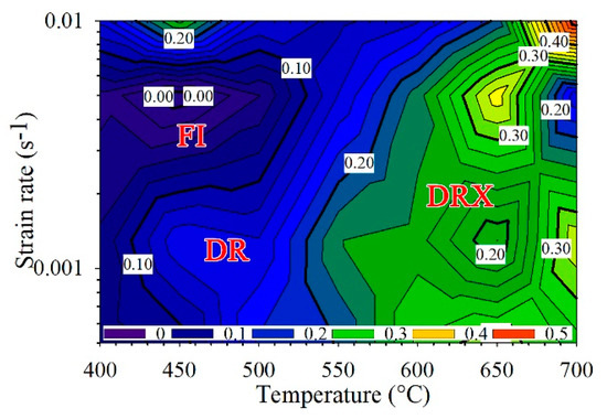 A processing map, representing the efficiency of power dissipation (η) for warm deformation at ε = 0.35, was constructed using the results of the calculation (Figure 9). This value of strain (0.35) was chosen to avoid the influence of friction between the specimen surface and the die at higher strains, especially at low temperatures. The border between the dynamic recovery/dynamic recrystallization areas corresponded to η~0.2 [36], that, depending on a strain rate, fell in the interval 550–600 °C. During deformation with strain rates close to 1.3·10−3 s−1, a rise in deformation temperature led to an increase in the efficiency of power dissipation to η = 0.3 and higher (at 700 °C), which was a consequence of a change in the mechanism of power dissipation from dynamic recovery to dynamic recrystallization. These results were in agreement with the result of microstructure evolution studies in the current work. However, deformation at 400 °C with almost all strain rates and in the temperature range of 400–500 °C with a strain rate of 5·10−2 s−1 can result in flow instability with the value of η~0.1. Moreover, the efficiency of power dissipation approaches values, typical of dynamic recovery, at 700 °C. An explanation of this behavior can be related with martensite decomposition during deformation and development of dynamic recovery/recrystallization; however, this point requires additional clarification.