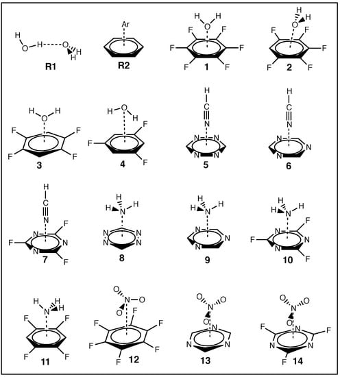 The current work investigates the interactions of –hole acceptors H2O, HCN, NH3, and NO3−, with the following aromatic –hole donors: C6F6, C6F5H, C6F4H2, C6F3H3, N3C3H3, N3C3F3, and N4C2H2 (see Figure 1). Original theoretical works of similar nature date back to 1997, when Alkorta et al. investigated the effects of F–substitution on reactivity of the aromatic rings in systems where small electron-donating molecules interact with the –clouds of benzene and hexafluorobenzene []. An extension of this work was reported in 2002, which included a larger array of aromatics and benzene derivatives and several negatively charged electron donors []. Simultaneously, a similar phenomenon was reported involving 1,3,5–triazine derivatives interacting with F−, Cl−, and azide (N3) [], and a computation study was combined with crystallographic evidence to confirm such interactions can favorably occur [].