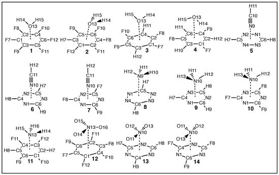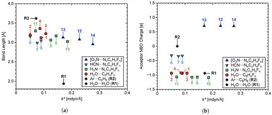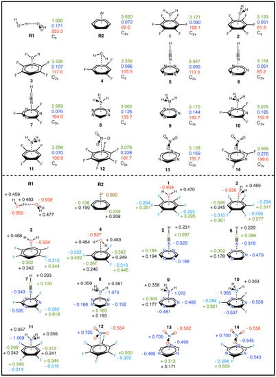 Table 3 summarizes the LVM data of the –hole interactions in 1–14 and two reference NCIs: R1 (water dimer) and R2 (Ar···C6H6). Figure 3 (top) shows molecular geometry of each system, r (shown in green), (blue), (red), and symmetry point group (black) for R1, R2, and 1–14. R1 and R2 have been incorporated to provide a frame of reference from well characterized compounds: The H2O dimer represents complex containing a strong HB with non-negligible covalent character, and Ar···C6H6 represents a weak NCI []. Also in Figure 3 (bottom), selected NBO charges are given, where charges in green represent C–atoms, O–atomic charges are red, H–atomic charges are black, N–atomic charges are blue, and F–atomic charges are light blue. Bond length r and NBO charge on the acceptor O and N–atoms are plotted with respect to in Figure 4a and Figure 4b, respectively. Shown as red plot points are interactions where H2O is the acceptor (1–4), light blue points represent HCN acceptor systems (5–7), in green are NH3 (8–11), blue points are the NO3− anion––hole interactions (12–14), and black points indicate R1 and R2. This color convention is maintained in the subsequent plots.