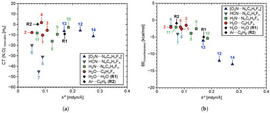 There is weak correlation at best between r and , which becomes weaker by presence of R1 and R2. The –hole interaction length in 14 is 1.000 Å longer than the HB in R1, yet the former has a value 0.100 mdyn/Å larger than the latter. The Ar···C6H6 interaction in R2 is at least 0.200 Å longer than all 14 –hole interactions, but is stronger than 2, 6, and 11. Figure 5a,b show charge transfer (CT) and BE counterpoise corrected for basis set superposition error; both plotted with respect to . CT was calculated as the transfer of charge between the acceptor lp–donor atom and the aryl ring. Both of these parameters correlate weakly with bond strength in terms of , but BE and show the best correlation of any properties considered in this work. Increase in magnitude of BE weakly correlates with increase in bond strength. The HB in R1 has a value three times larger than the weakest –hole interactions (2 and 6). On the other hand, 14 contains the strongest –hole interaction in this work with a value 60% larger than of the HB in R1.