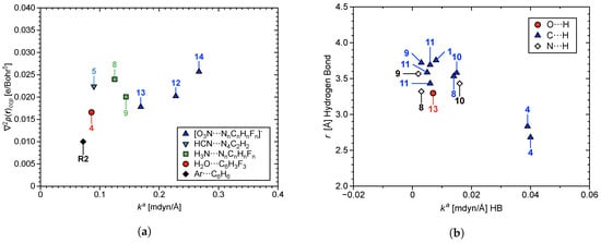 (a) The Laplacian of the electron density at the CCP (), and (b) r of the HBs; both plotted with respect to of –hole interactions in 1–14 and R2.