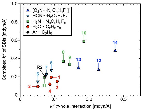 In Figure 6a, the Laplacian of the electron density (), where CCP is a cage critical point encompassing N– or O–atoms from the acceptor and aryl C or N–atoms from the donor, is plotted with respect to . tracks regions of local charge concentration/depletion []. increases with increasing strength of the –hole interaction. In other words, increased local concentration of charge at the CCP corresponds to a stronger –hole interaction. Figure 6b shows correlation between r of the HBs and their values, where increased bond length corresponds to weakening of the HB. Figure 7 shows combined values of all SBIs/HBs per –hole system, plotted with respect to of the –hole interaction; where the larger quantity of stronger SBIs/HBs weakly correlate with stronger –hole interactions. This correlation is weak because the HB can strengthen or weaken the –hole, depending on the directionality of HB donation; a topic which is discussed further in Section 3.5.