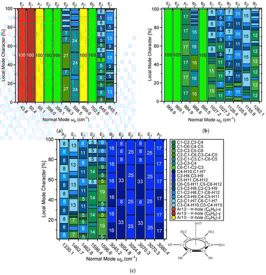 Decomposition of normal vibrational modes into % LVM contributions for the Ar···C6H6 dimer R2; (a) % LVM contributions to normal vibrational modes 1–11, (b) % LVM contributions to normal vibrational modes 12–22, and (c) % LVM contributions to normal vibrational modes 23–33.