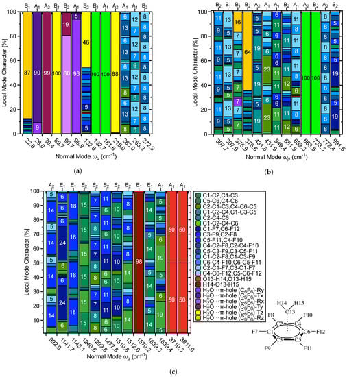 Decomposition of normal vibrational modes into % LVM contributions for the H2O···C6F6 –hole system 1; (a) % LVM contributions to normal vibrational modes 1–13, (b) % LVM contributions to normal vibrational modes 14–26, and (c) % LVM contributions to normal vibrational modes 27–39.