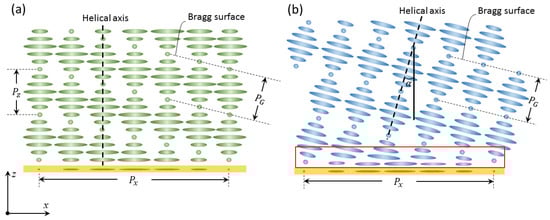 Recently, some experiments on the polarization response in PVG indicate that the bulk structure may be in a slanted configuration [24]. This issue is explicitly explained in [15] through simulation and experimental validation. The slanted PVG, as shown in Figure 1b, preserves the perfect helical structure in the bulk, which results in its lowest free energy (the bulk free energy is zero). The Bragg pitch PG in this case is equal to the CLC pitch PCLC. The bottom alignment gives the bulk helical structure a tilt angle α = arcsin(PG/PX) so as to match the bottom k-vector with the bulk periodic structure. To transit from the bottom planar alignment to the bulk slanted structure, there exists a transitional region (red box in Figure 1b) with non-zero free energy. However, the thickness of this transitional region is usually very small (tens of nanometers), so its contribution to the total free energy is minor. Therefore, the large-angle PVG formed by one-time spin coating or cell formation manifests the slanted structure.