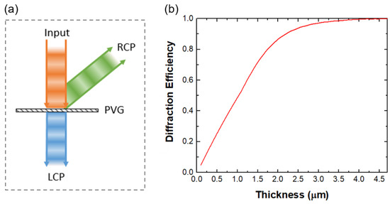 (a) Schematic of the beam diffracted by a PVG. (b) Simulated diffraction efficiency as a function of film thickness. The diffraction efficiency is defined as the ratio of first-order diffracted light to incident light at a specific diffraction angle and center wavelength. The horizontal period is 440 nm, vertical period is 205 nm, Δn = 0.15, the diffraction angle is 50°, and the central wavelength is 532 nm. The efficiency is higher than 95% when the thickness exceeds 3 µm.