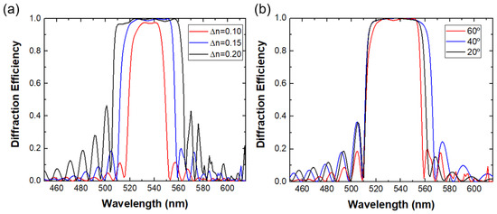 As analyzed in Section 2, the Bragg diffraction of PVGs is based on the helical twist along the LC optical axis. Therefore, the effective index modulation in PVGs is essentially the birefringence of the LC material. Due to the matured LCD industry, a wide range of birefringence (Δn = 0.05 to 0.4) is available. Same as the spectral properties of CLC, the reflection band of PVGs could be easily tuned by using a LC with different Δn, as Figure 3a depicts. Usually, as Δn increases, the reflection band grows wider. Furthermore, Figure 3b shows the diffraction efficiency spectra at three different diffraction angles with Δn of 0.15. From these simulation results, we can see that the diffraction efficiency and bandwidth are almost independent of diffraction angle. This means the PVGs can diffract light to different angles while keeping high efficiency, which is a very favorable feature for near-eye display systems.