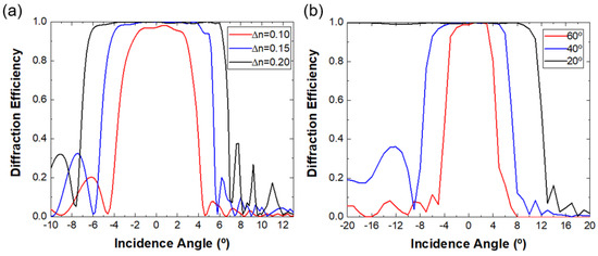 Angular response of PVGs. The horizontal period (Px) is 440 nm, vertical period (Pz) is 205 nm, and the central wavelength is 532 nm. (a) Diffraction efficiency versus incident angle at three refractive index contrasts with 50° diffraction angle and (b) three diffraction angles with Δn = 0.15.