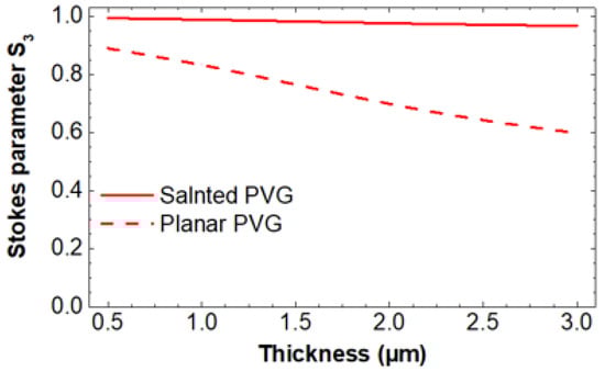 To investigate the polarization property of the diffracted light, we use Stokes parameter S3 as an indicator. S3 denotes the degree of circular polarization of light. For example, S3 = 1 means right-handed circularly polarized light, while S3 = −1 stands for left-handed circularly polarized light. In the simulation, the horizontal period (Px) is 440 nm and vertical period (Pz) is 205 nm, which results in a slanted angle of α = 25°. The central wavelength is set at 532 nm, and Δn is 0.15. At normal incidence, the first-order polarization state of the slanted configuration is very close to circular polarization, as shown in Figure 5. By contrast, the diffracted light from the planar PVG significantly deviates from the circular polarization.