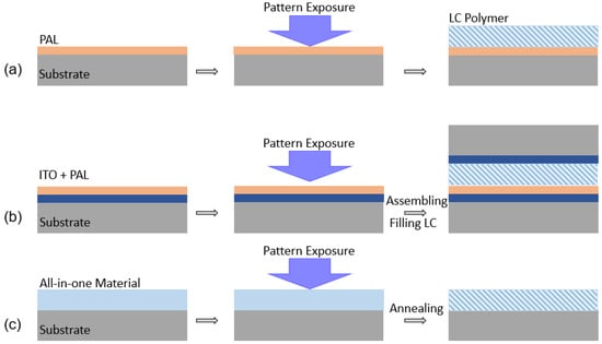 In addition to unique optical characteristics, simple fabrication process is another noteworthy advantage of PVGs. Since PVGs are essentially a grating based on liquid crystal, recording high-quality patterns to align liquid crystal molecules is an important step during fabrication. Compared to conventional rubbing method [27], photo-alignment is a more advantageous option for generating precise patterns [28,29,30].