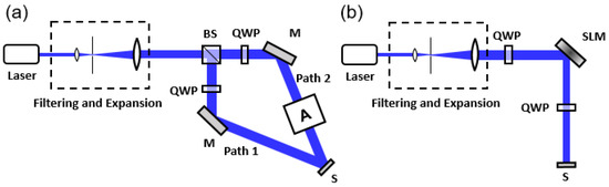 The polarization field used to provide LC orientations is usually generated by light exposure [42,43,44]. In the simplest case, the grating can be formed by a polarization interferometer, as shown in Figure 7a. The linearly polarized laser beam is filtered and expanded, then split into two arms by a beam splitter (BS). A quarter-wave plate is placed in each arm to convert the incident light to RCP (Path 1) and LCP (Path 2). Then, these two beams are reflected by the mirrors (M) to interfere at the sample (S). Normally, the PVG phase can be obtained without other optical components in box A. However, appropriate modifications can be made to achieve exotic PVG phase profiles. For example, if a cylindrical lens is added, then the polarization filed has an additional parabolic phase in one dimension, so that the fabricated PVG shows a period of gradient change according to the direction of the cylindrical lens. In addition, if a lens is added, then the final PVG would have an additional parabolic phase profile in two dimensions, which makes it no longer a grating, but a polarization volume lens.