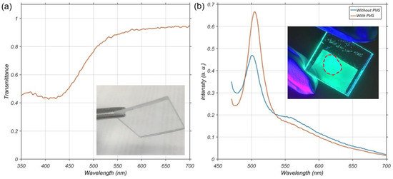 where is the thickness of the PL layer and is the diffraction angle from the PVG. Although part of the excitation light is extracted from the light-guide during the second interaction with PVG, the geometrical optical path length is already significantly increased before this happens. For example, if the diffraction angle is around 60° for the excitation light, the effective path length is four times longer than the thickness of the PL. In other words, the optical density of the PL layer can be four times smaller while keeping the PL intensity unchanged under the same excitation circumstance. As a proof of concept, we fabricated a PVG with high efficiency at 350~400 nm for one polarization, whose zero-order transmittance is plotted in Figure 9a. Then, we attached on top of the PVG the PL layer, which is a polymeric film filled with perovskite quantum dot that emits green light under excitation [48]. Then the fabricated assembly was exposed to a UV flashlight for excitation. The area of the PL layer is larger than that of PVG, as marked by the red dashed lines in the photograph inside Figure 9b. The area with PVG (inside the red circle) appears brighter than the surrounding area. In addition to visual inspection, we also measured the brightness enhancement. The PL spectra with and without PVG were measured with a spectrometer (Ocean Optics spectrometer HR4000CG-UV-NIR, Ocean Optics, Inc., Florida, USA), and the results are plotted in Figure 9b, which prove that the PL intensity can be significantly enhanced with the proposed PL enhancement film. Here, the employed PVG only has one chiral layer and it diffracts RCP light. Thus, if a two-layer PVG that can diffract both RCP and LCP lights [7] is applied here, the PL intensity can be further enhanced. It is also noteworthy that PVGs working at deep blue or UV spectrum can manifest high transparency in the visible spectrum, as shown in the inset photo in Figure 9a. This merit enables another useful application for PL-based projection displays [49].