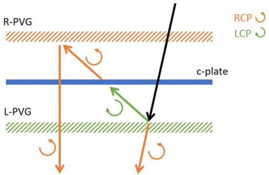 Thanks to their distinct polarization response and high diffraction efficiency, PVGs can also function as a polarization converter to convert an unpolarized light to a polarized light. In a high contrast LCD, a linearly polarized light is required. However, the most commonly used LED (light-emitting diode) backlight emits unpolarized light. Thus, instead of sacrificing half of the light using an absorptive polarizer, a polarization converter [50] can help make full use of the light from an unpolarized light source. Here, we provide the design of a novel thin-film polarization converter employing two PVGs and a c-plate, which is a homogeneous uniaxial layer with a c-axis perpendicular to its surface. The key feature of c-plate is that it generates phase retardation only for the oblique incident light, but not normal incidence. Figure 10 illustrates the design and working principle of the PVG-based polarization converter.
