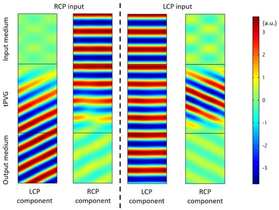 Electric field distribution in a polarization converting transmissive PVG. Scale bar indicates the electric field distribution. Tilt originates from the diffraction of the transmissive PVG.