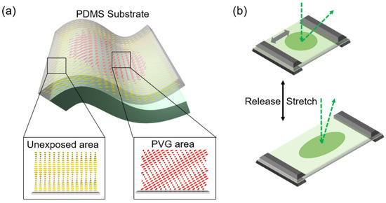 (a) Schematic illustration of stretchable PVG film. (b) Schematic diagram of mechanically controlled PVG film for continuous beam steering.
