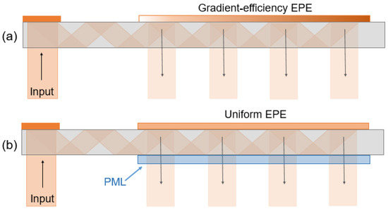 Schematic illustration of waveguide-based optical systems. (a) Using gradient-efficiency output coupler. (b) Using uniform-efficiency output coupler with a PML.